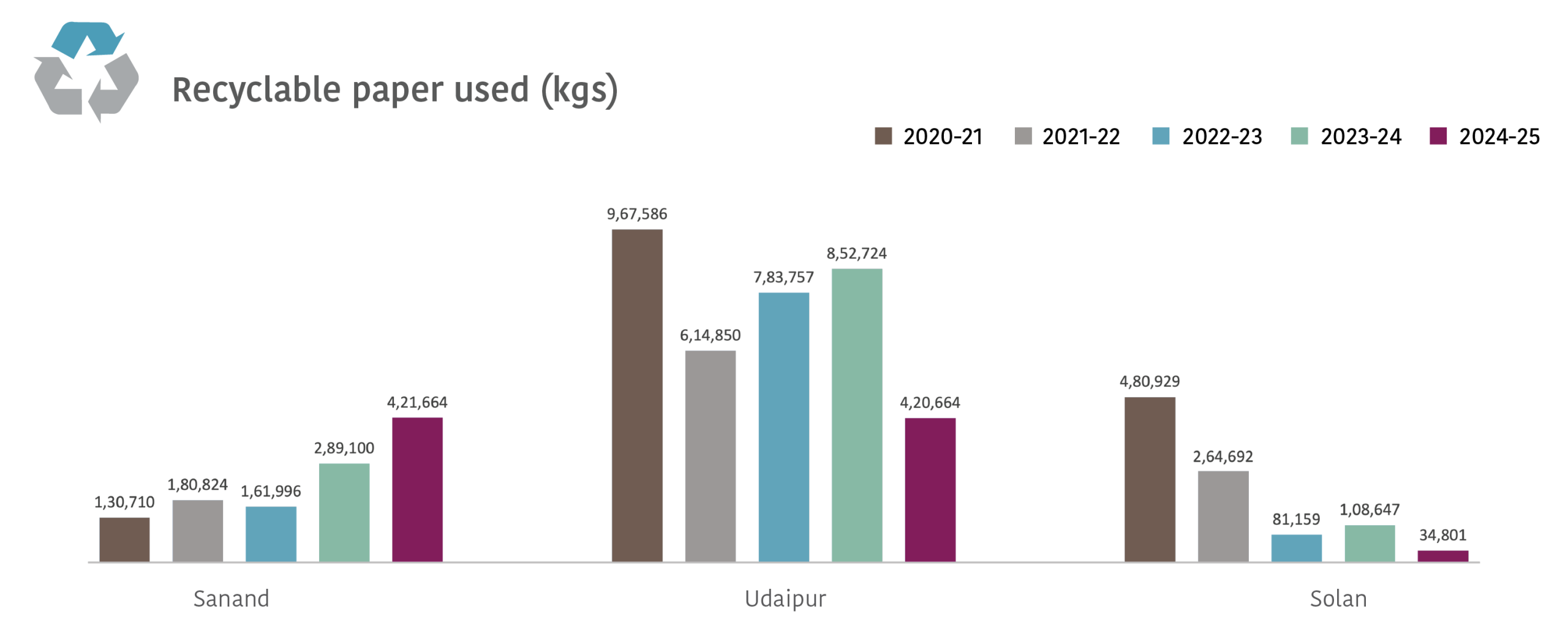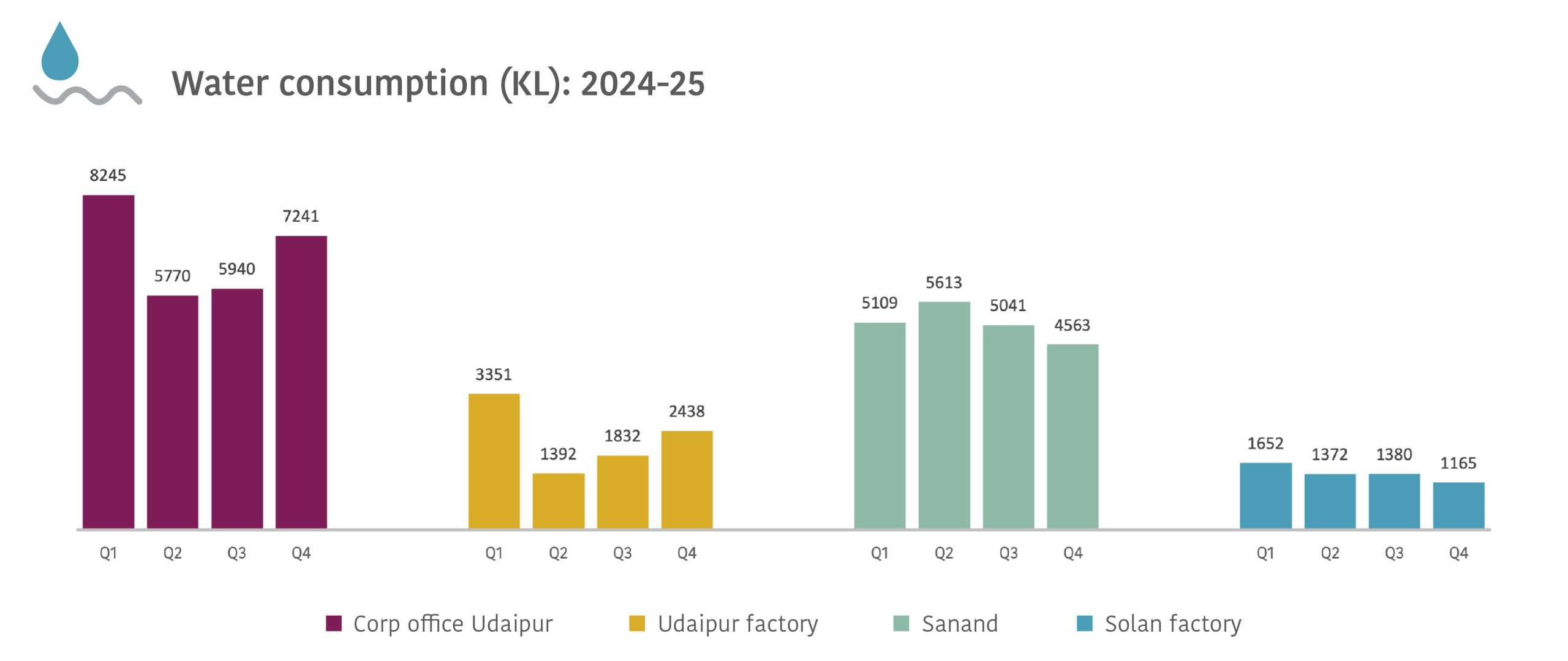 We understand water is a scarce resource and must be used optimally. We harvest rainwater in all our major operation sites in India for gardening purposes. Waste water is treated in three of our manufacturing plants for garden use. Last year we treated over 1,500 kilolitres of water. At our largest plant, we purify and recirculate used water for flushing. Our manufacturing processes do not need water, so we consume recycled water for gardening, human use and consumption. We have low-flow water fittings installed in our company-owned premises.